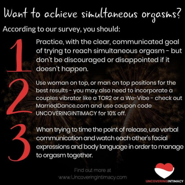 Они объясняют это тем, что партнеры, которые несколько лет вместе, досконально изучили тело друг друга и знают, как довести партнера до оргазма, мало того, они знают как «подогнать» свой оргазм под оргазм своего партнера. Еще молодым, но достаточно амбициозным парам придется сперва многому научиться, а уж только потом наслаждаться одновременным оргазмом.