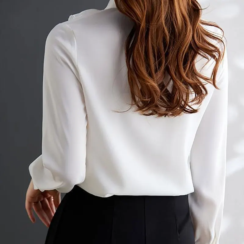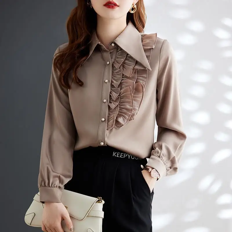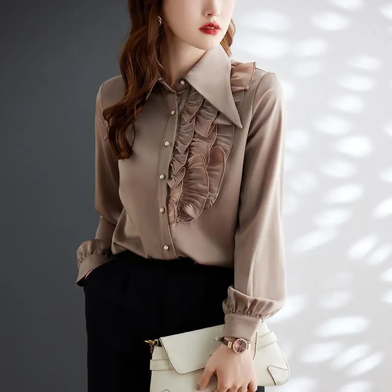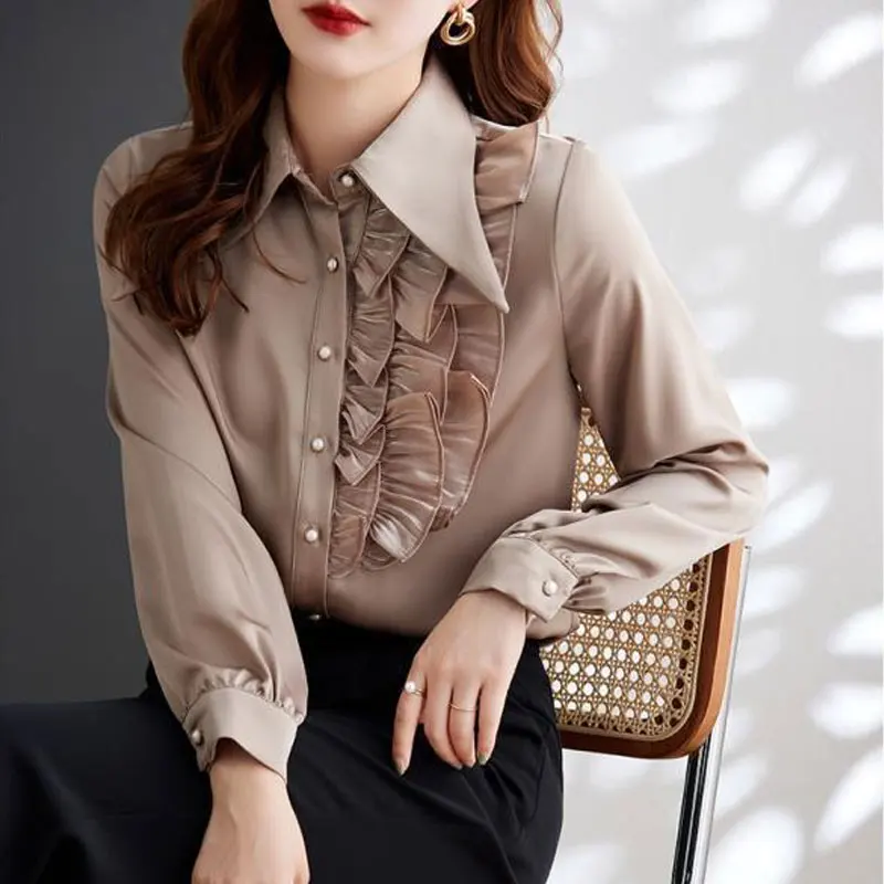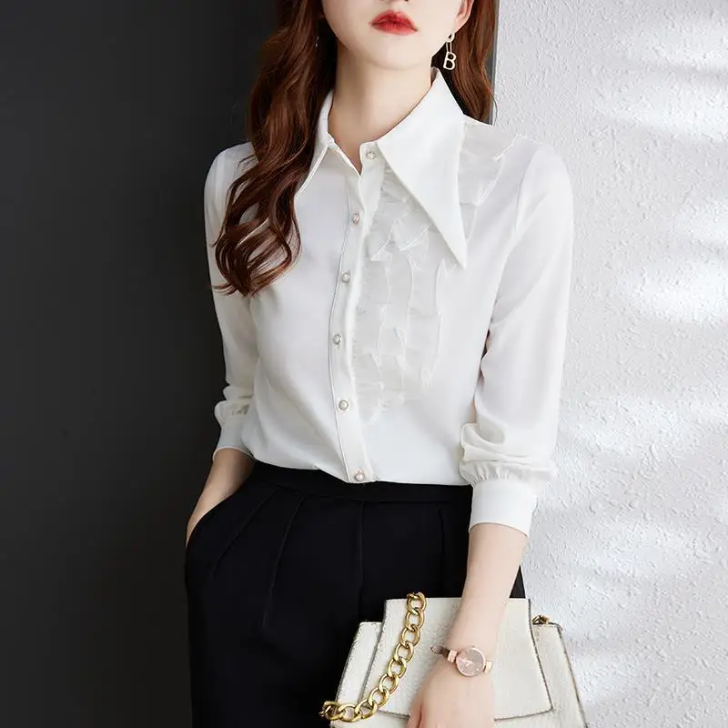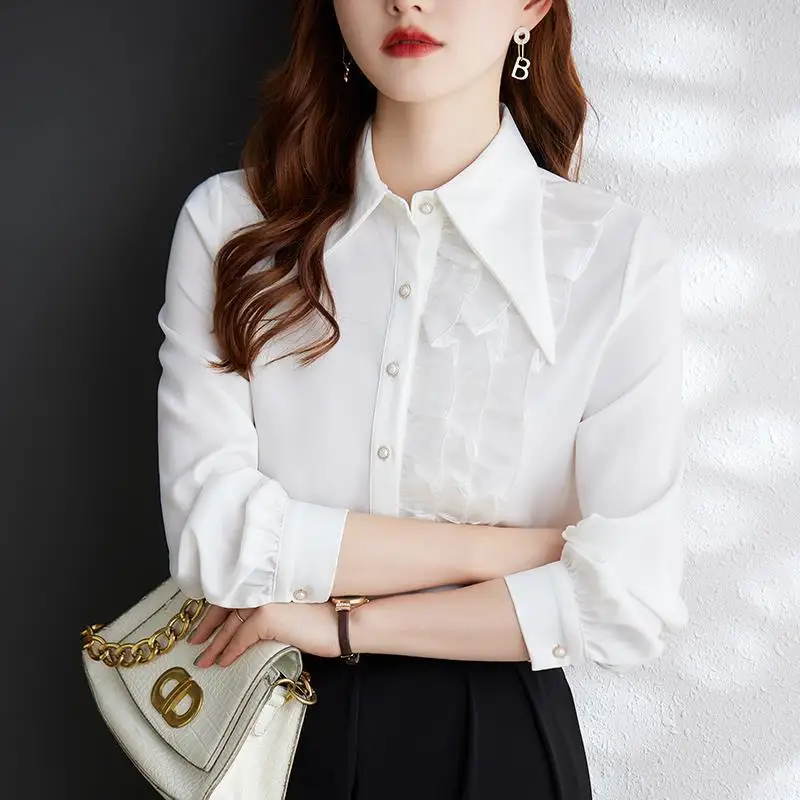 aNITgLsIzHere you can buy Office Lady Ruffles Patchwork Blouse Stylish Asymmetrical Spring Autumn Chic Pearl Single-breasted Female Turn-down Collar Shirt with free delivery to your post office.