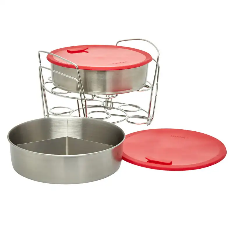 "Official 8-piece Cook/ Set 2 Pans, 2 Wire Racks, 2 Red Silicone Lids, 1 Removable Divider, and Removable Base" * Buy Now With Free Shipping Just For $28