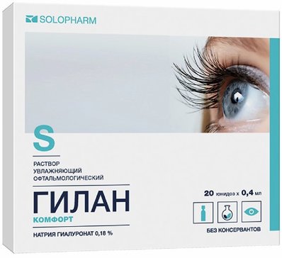 Устраняет сухость глаз, возникшую ввиду проблем со слезной секрецией, возрастом или под воздействием внешних факторов (это может быть дым, холод, флуоресцентные лампы, оказывающие негативное влияние на глаза) . Сейчас очень популярен препарат «Гилан Ультра Комфорт» .