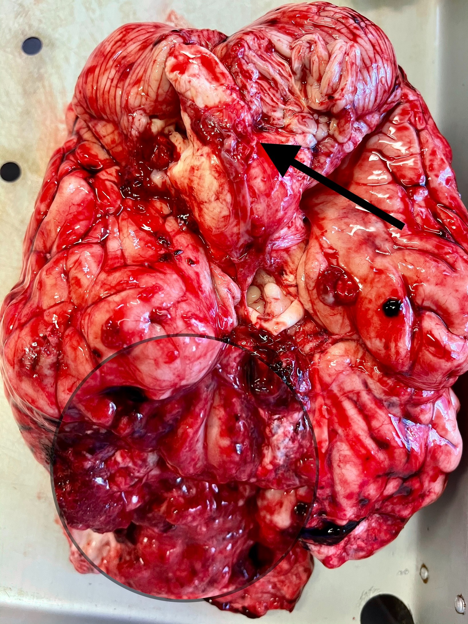 Обширная зона оскольчатых переломов костей основания черепа обведена. Стрелка указывает на большое затылочное отверстие, в котором виден фрагмент спинного мозга.