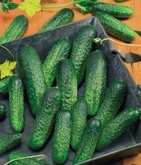 Фото огурцов Гуннар F1 . Плоды темно-зеленого цвета, на кожуре нет никаких пятен или полос, она однотонная, только ближе к кончику цвет может светлеть . Длина зеленцев 12-14 см, форма у них . . .