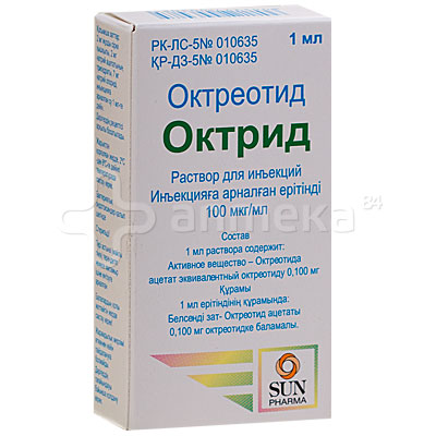 Состав и описание . Активное вещество: 1 ампула содержит: октреотида 50 мкг или 100 мкг . Вспомогательные вещества: Натрия хлорида 9,0 мг, воды для инъекций до 1 мл . Описание: Прозрачная бесцветная жидкость без запаха . Форма выпуска: Раствор для внутривенного и подкожного . . .
