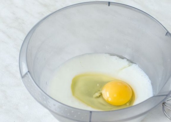 2. Кефир выливаем в глубокую миску. Вбиваем яйцо и слегка взбиваем венчиком.