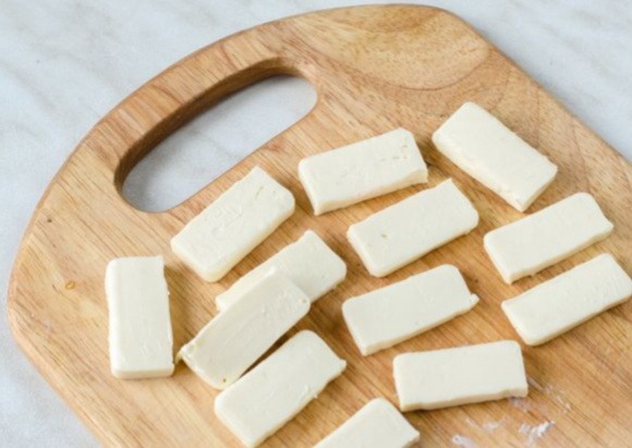 6. Сыр нарезаем небольшими ломтиками.