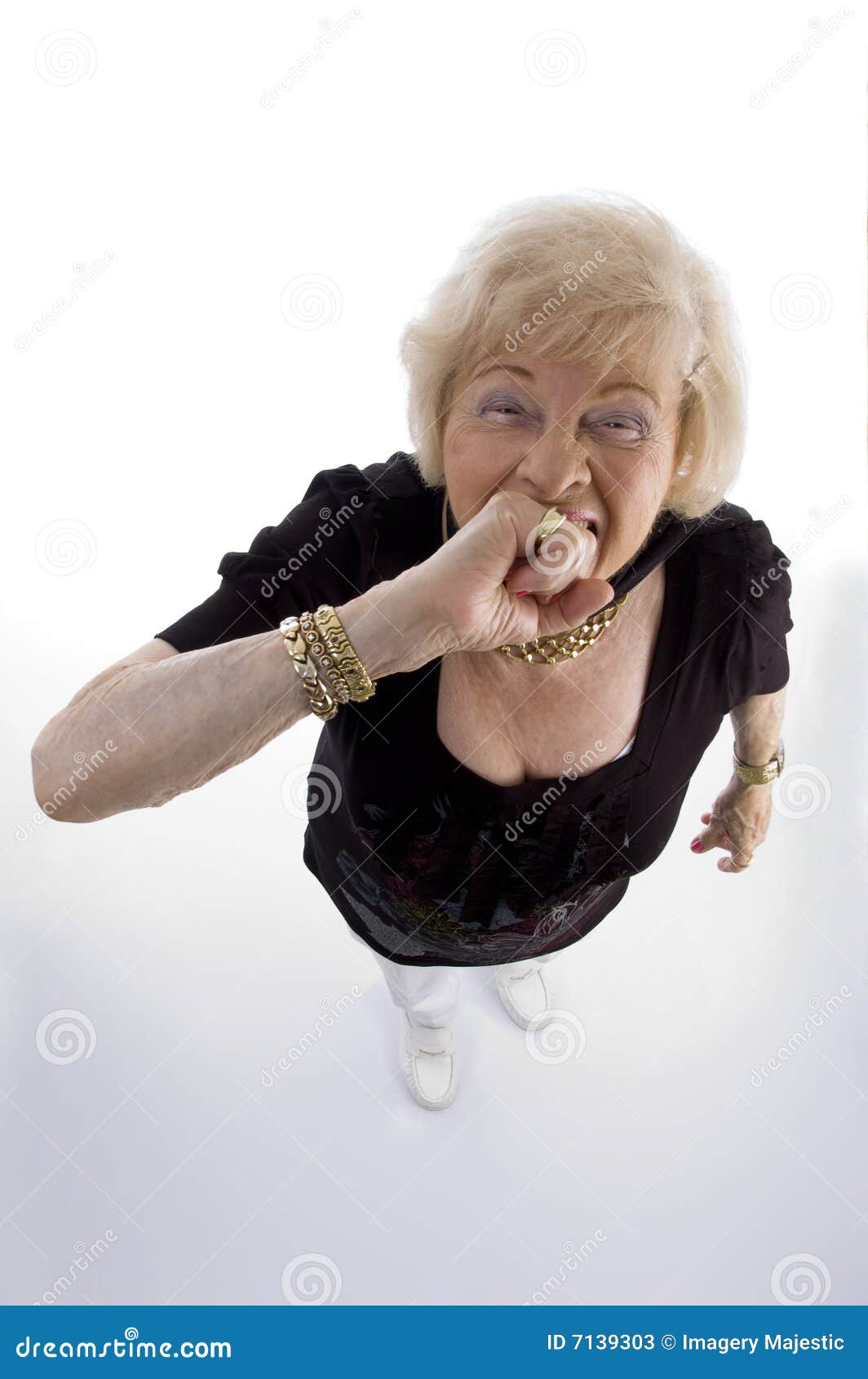 High angle view of old woman keeping fist. In her mouth with white background