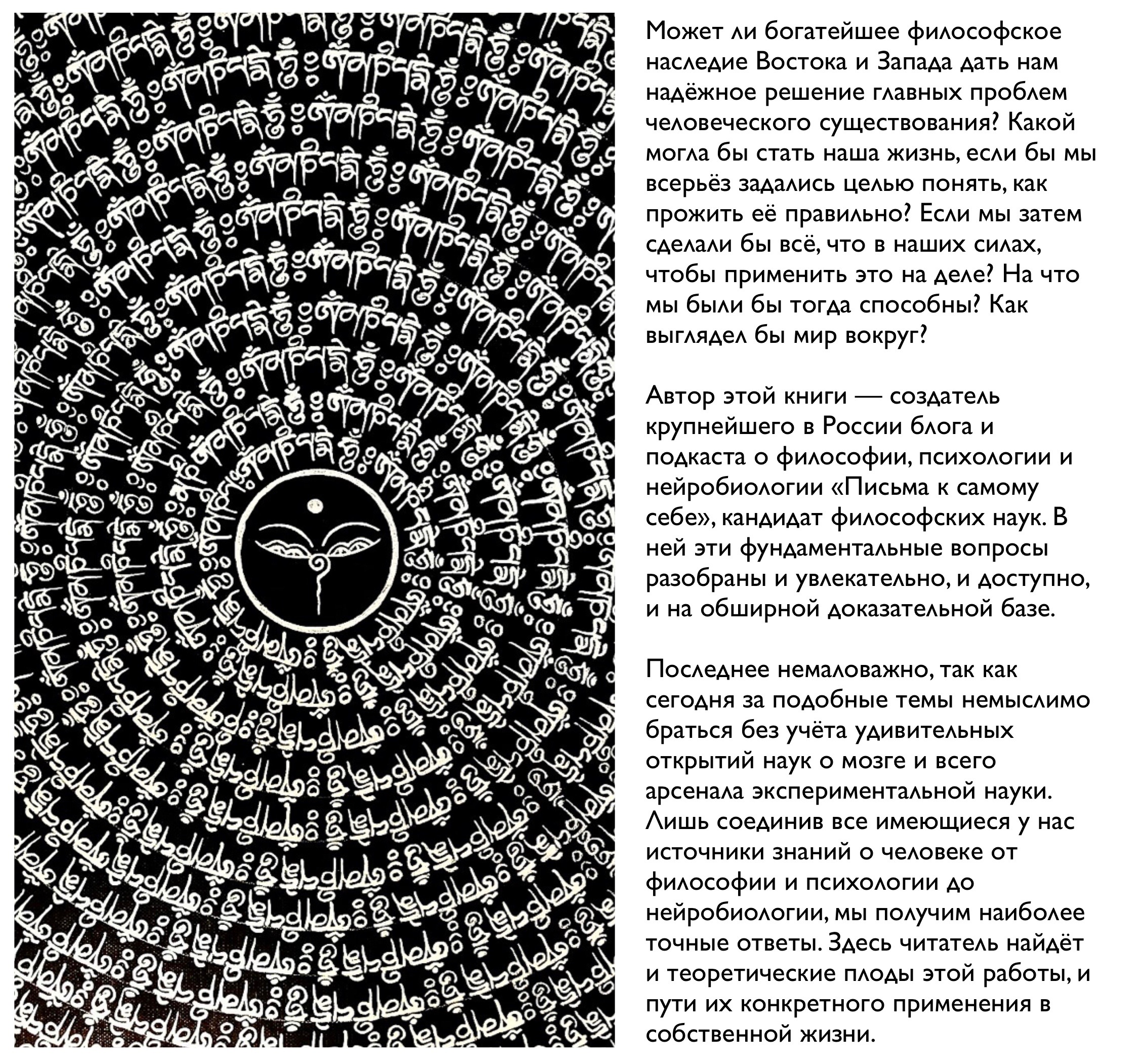 В исследовании того, как выстраивать жизнь и управлять своими психическими процессами, мы оттолкнёмся от философского наследия человечества. Однако оно не может быть единственной опорой. Знание будет действительно надежным лишь тогда, когда мы примем в расчет все дисциплины, занимающиеся человеком, и не потеряем связи с современным состоянием науки. Сегодня, благодаря прорыву в исследованиях мозга, эволюционной биологии и нейробиологии, а также технологиям вроде фМРТ и ТМС, ряд важнейших проблем устройства нашей психики перестают быть предметом гениальных догадок и входят в область точного знания. Теперь мы способны проверять и обосновывать многие философские тезисы строгими научными методами и выявлять закономерности процессов в мозге, ответственных за те или иные состояния, переживаемые индивидом.