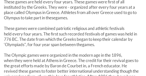 The Olympic Essay - Essay 1 History of Olympic Games . 3000 years before, from now, the ancient games took place in honor of Lord Zeus . It was all started from a town named Olympia near the Peloponnese peninsula in Greece . Olympics were first held in 776 BCE . These games were held every 4 years from 8th century B .C . to 4th century A .D . . .