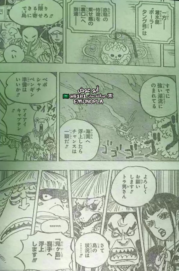 Law: Get as close to the island as you can.We are being swallowed by a strong tide already, once we rise to the surface our chance will be momentary! Bepo, Shachi, Penguin are you ready!?