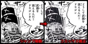 Capitolo 1097 - Pagina 12: Kuma si riferisce a Dragon usando "Dragon" e non più "Dragon-san". Sono state aggiunte delle linee verticali bianche alle vele nere della nave dell'Armata Rivoluzionaria.