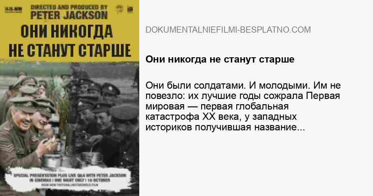 «Они никогда не станут старше» (англ . They Shall Not Grow Old) — документальный фильм режиссёра и продюсера Питера Джексона .Картина приурочена к 100-летию окончания Первой мировой войны .Премьера фильма состоялась 16 октября 2018 . . .
