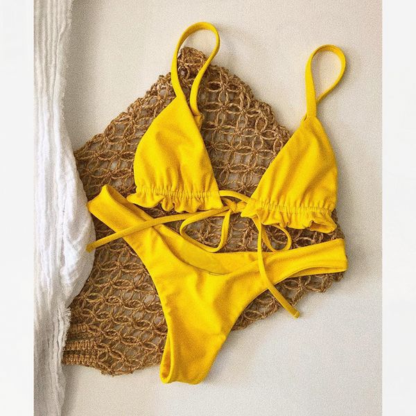 Комплект включает в себя мини-бикини с утончёнными завязками на бёдрах и классический лиф, представленный двумя треугольниками на завязках . Жёлтый цвет красиво оттеняет загорелую кожу .