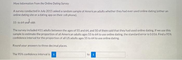 Online dating is a growing trend among single adults . According to the Pew Research Center, the percentage of people between ages 55 and 64 who used a dating site or app has increased from 6% to 12% in just three years .