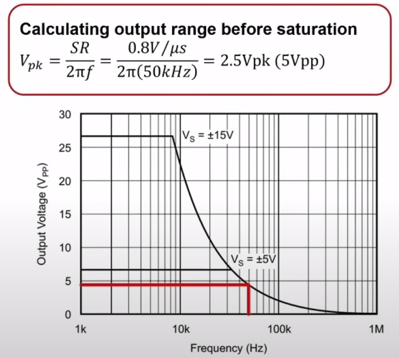 Достаточно, всё так же, знать частоту сигнала, slew rate и формулу с картинки ниже. С ее помощью можно посчитать максимальную амплитуду, при которой операционник не будет искажать входящую в него синусоиду. Диапазон таких частот в англоязычной литературе называется Power Bandwidth.