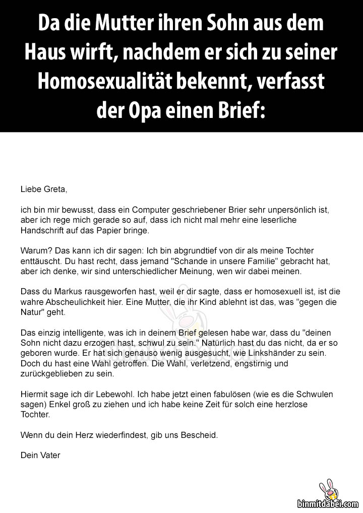 Sein Opa sagte nicht schwul , sondern: warmer Bruder . In der Stadt, in der sie lebten, gab es einen warmen Bruder, einen Sattlermeister, dem wurde nachgesagt, dass er es mit Lehrlingen treibt, . . .