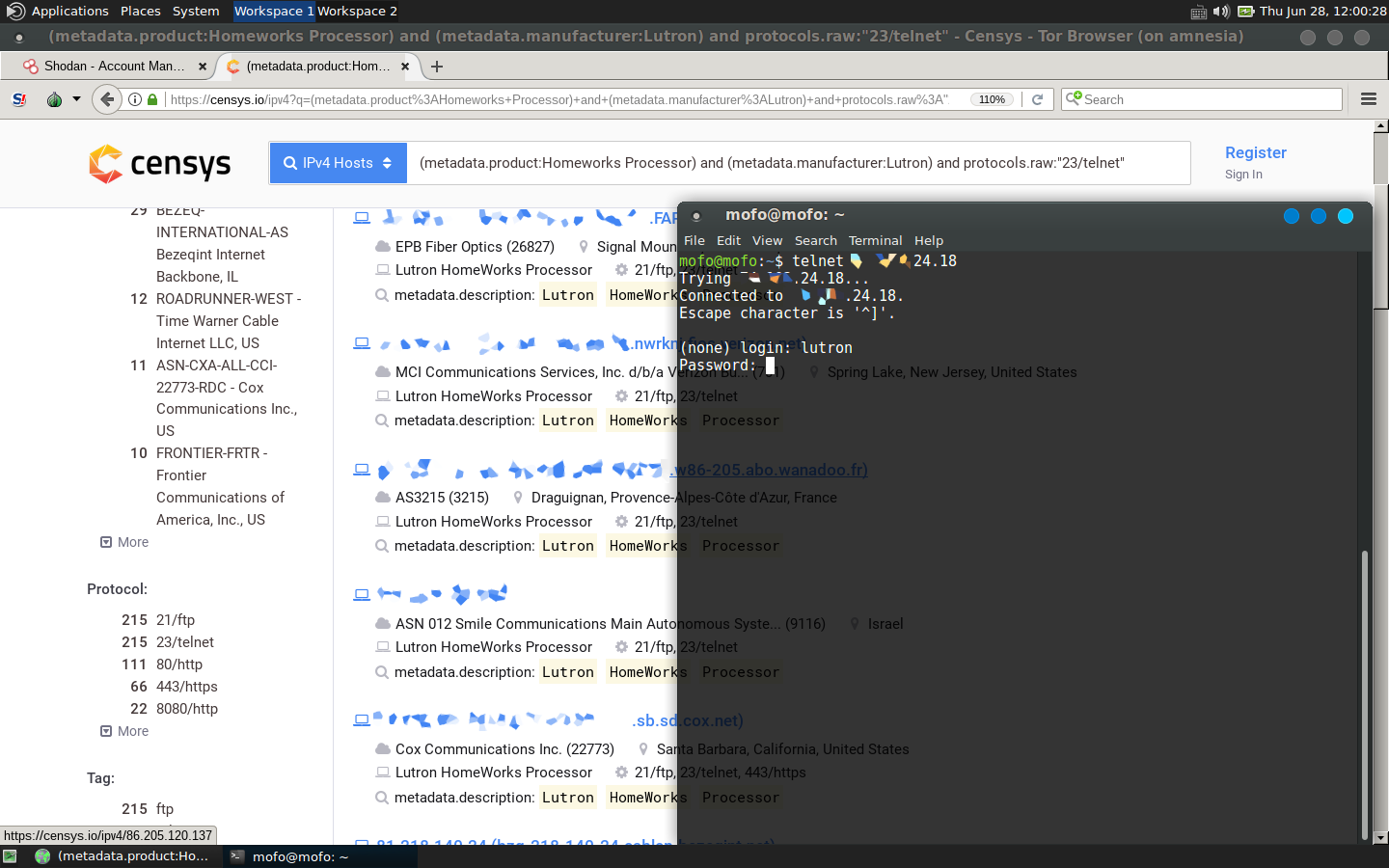 Почему казалось? Да потому, что в реальности не все так просто. Обнаруживший эту уязвимость Давид «SadFud75» Кастро (David Castro) приводит красивый поисковый запрос для Censys: (metadata.product:Homeworks Processor) AND protocols.raw: "23/telnet". Сейчас по нему находится более двух тысяч лутроновских устройств с открытым портом 23 (совсем недавно их было больше семи тысяч). Сначала глаза разбегаются, а затем впадаешь в отчаяние. Ты пингуешь уже сто первый узел, но и он не принимает указанные пары логин/пароль. В чем же дело?