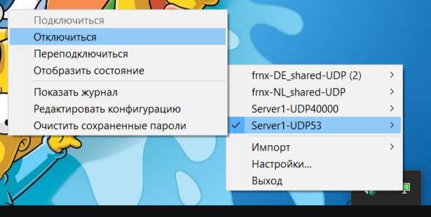 8 Для отключения навести на импортированный конфиг и нажать "Отключиться".