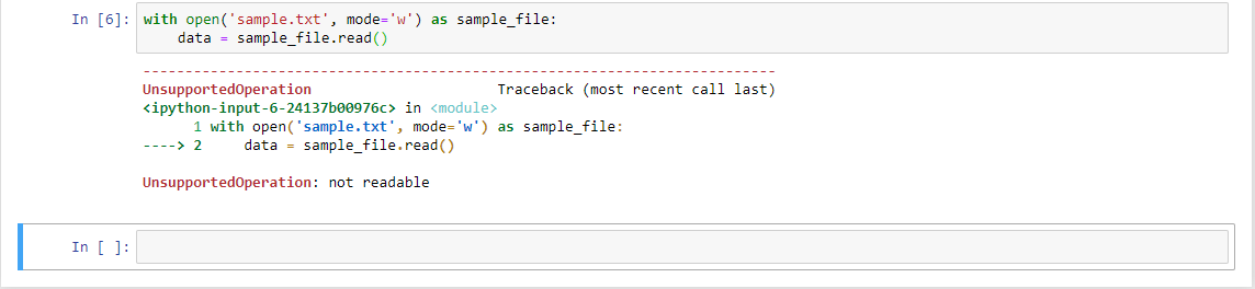 Вот и пример того, что если открыть в режиме записи и попытаться прочитать файл - мы получим ошибку.