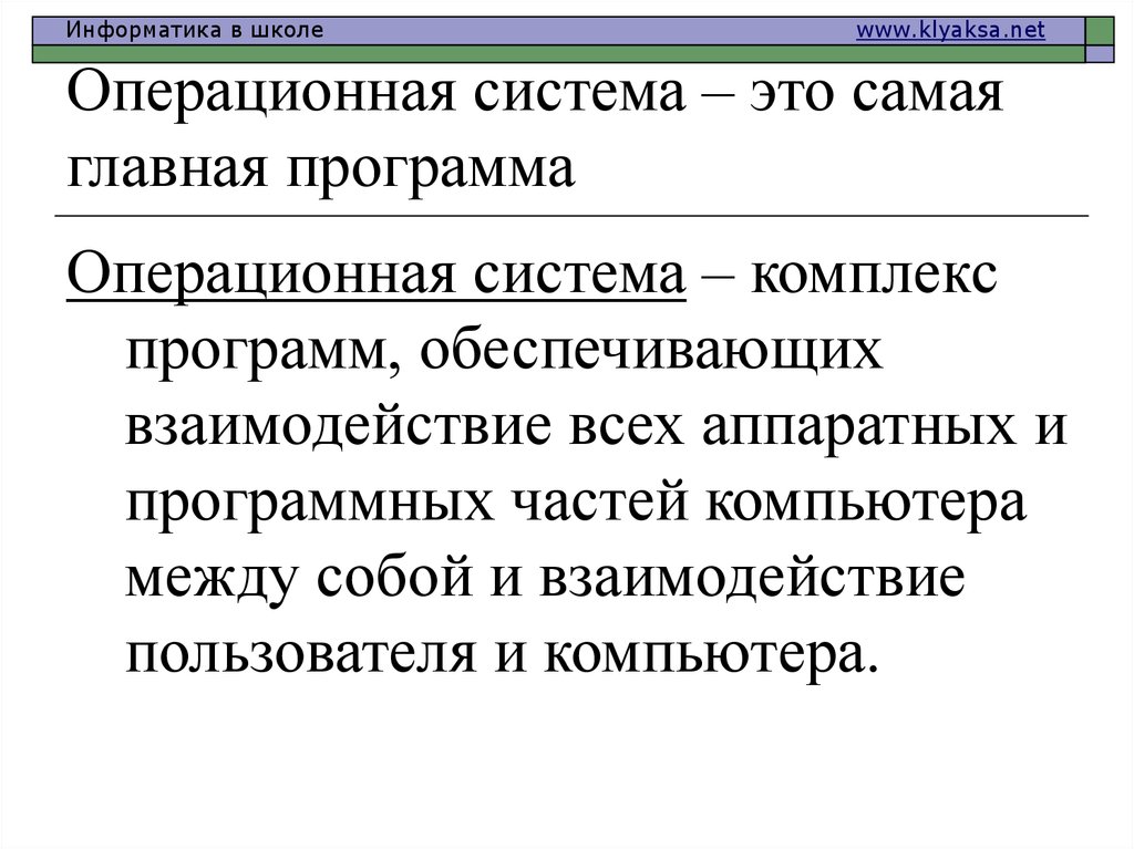 Операцио́нная систе́ма, сокр . ОС — комплекс взаимосвязанных программ, предназначенных для управления ресурсами компьютера и организации взаимодействия с пользователем . В логической структуре типичной вычислительной системы операционная система занимает . . .