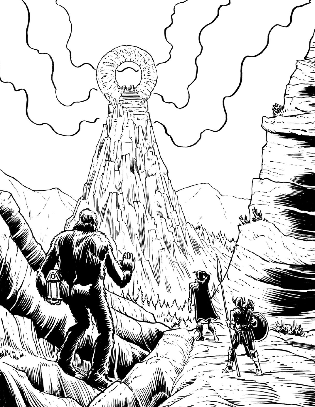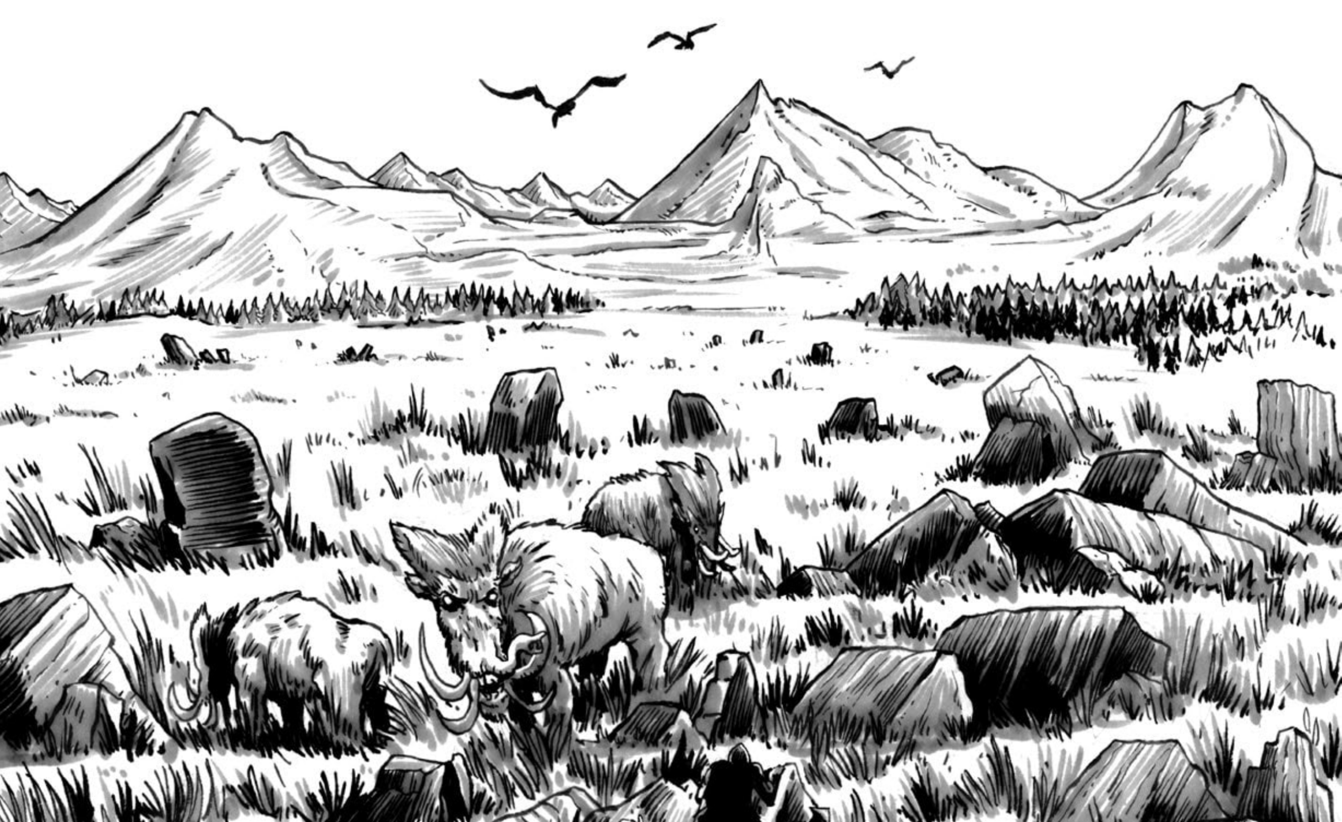 Но одним подземельем дело не заканчивается, и к Operation Unfathomable естественным образом присоединено еще одно приключение-песочница - Odious Uplands, описывающее огромный регион провинции Stonespear (Камнекопейск, как игроки в итоге перевели), расположенный над подземельем из Operation Unfathomable. В регионе этом тоже все не так уж ванильно: по равнинам бродят мастодонты с четырьмя хоботами и бивнями-экскаваторами, где-то в топях за наполненным кракенами озером живет бог-сом Атхохта, тут и там встречаются колоссальные окаменелости фантастических существ, а над всем этим высится невозможная гора, увенчанная огромным каменным бубликом, вокруг которого регулярно случаются авроры Хаоса.