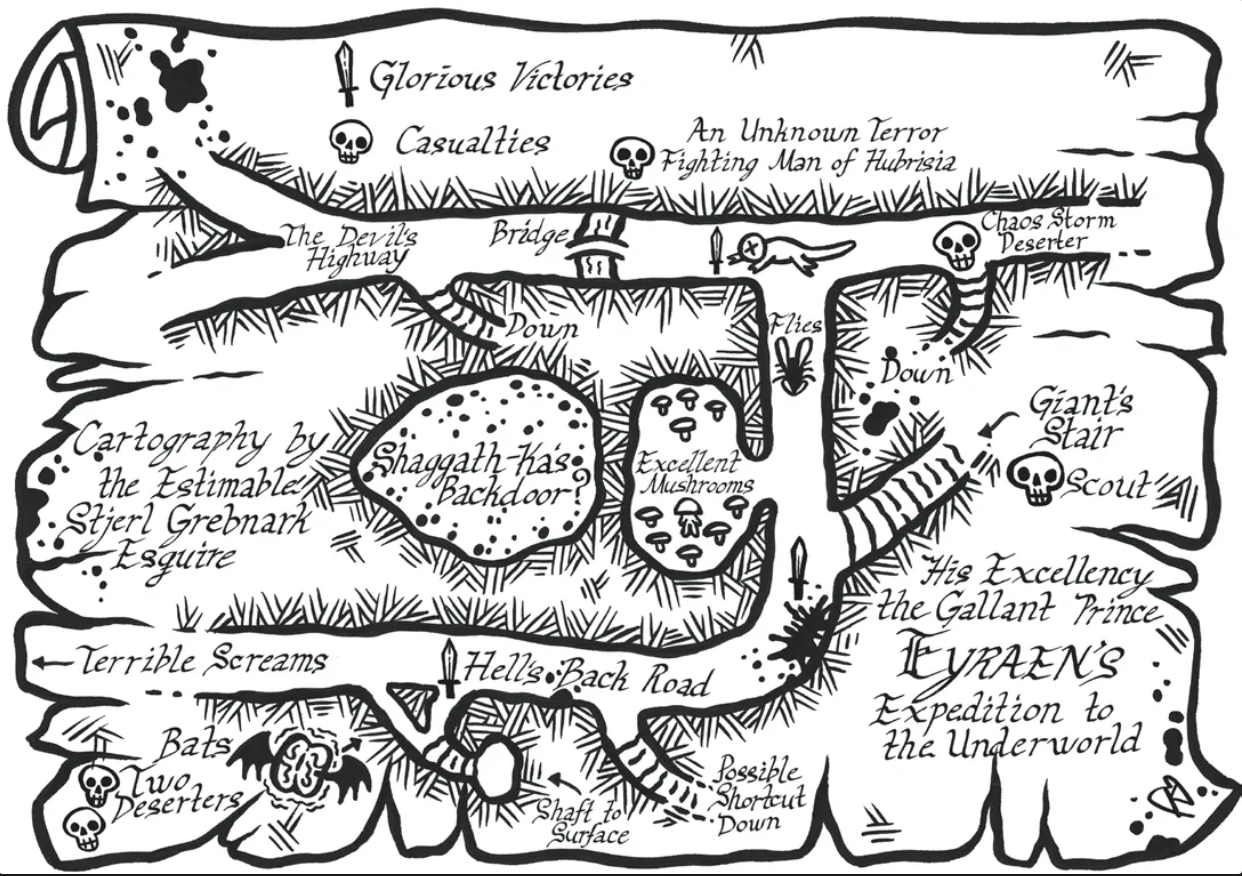 И если первое приключение-подземелье имеет хотя бы номинальную цель (вернуть королю-колдуну крайне опасный и ценный жезл, похищенный взбалмошным принцем), то второе сделано так, чтобы игроки сами ставили себе цели, взаимодействуя с миром, фракциями в нем, различными странными персонажами и силами. Однако никаких рельсов даже в Operation Unfathomable нет и в помине, так что суммарно мы имеем просто одну большую песочницу, в которой имеется надземная и подземная части. Что, кстати, довольно сильно отличается от типичного DCC’шного модуля, многие из которых грешат рельсовостью.