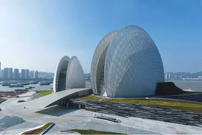 Легкая, динамичная конструкция — проект на острове Чжухай в китайской провинции Гуандун. Театр Zhuhai словно парит на фоне воды, сливающейся с небесами, подчеркивает эстетику формы. Композиция здания придумана в виде двух изогнутых структур, которые напоминают раскрытые раковины.