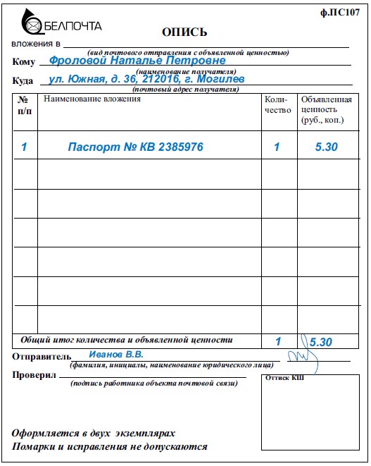 Опись вложения заполнить образец 137 фото