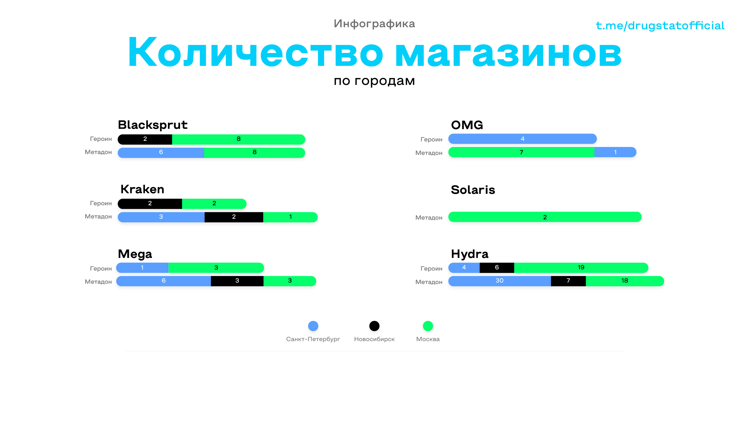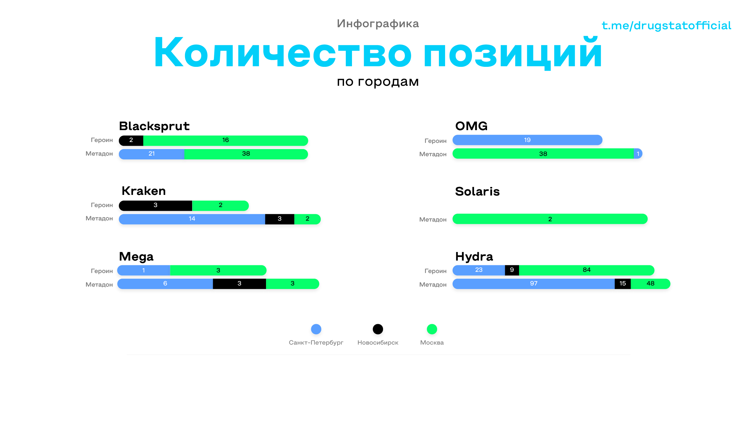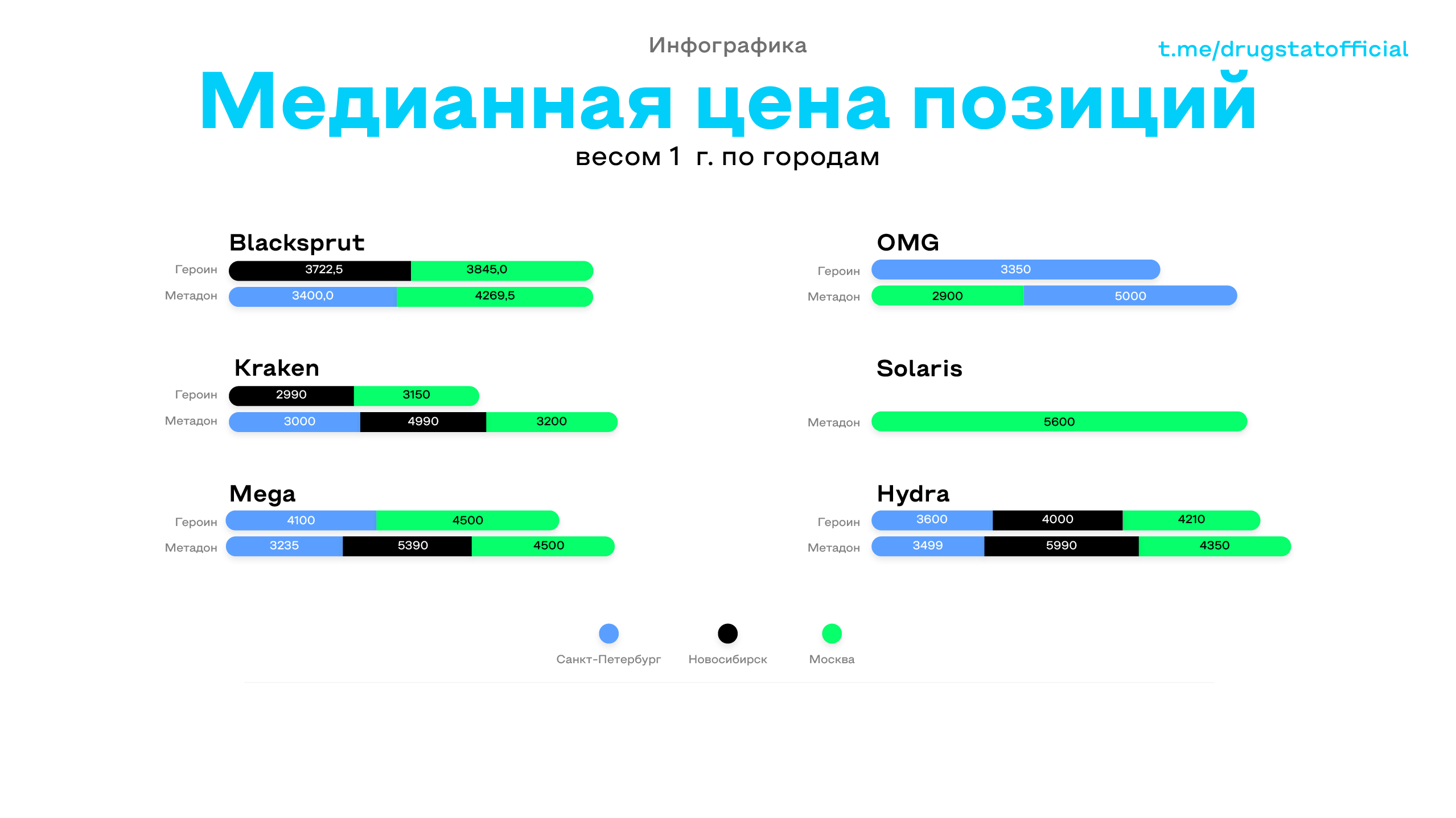 1. В Москве максимальная цена на героин составляет 4500 рублей (на MEGA) - минимальная равна 3150 (на Kraken). Также стоит отметить, что на OMG героин на московском рынке не присутствует, а Solaris в принципе не торгует данным товаром.