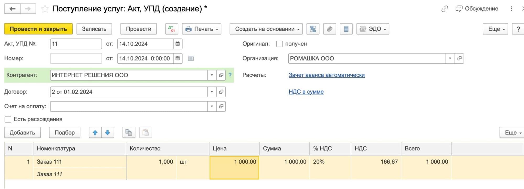 Оплата аренды проводки в 1с
