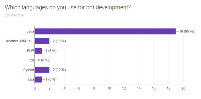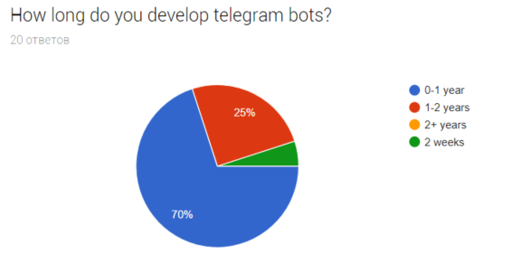 Если вы читаете эти строки значит вы там где нужно - на канале Джун уронил прод. Сегодня мы с вами рассмотрим статистику собранную мной на одном из телеграм каналов: @javabotsapi. Я провел опрос среди пользователей канала, которые, в основе своей, разработчики телеграм ботов. Опрос я проводил с помощью вот этой формы. Получилась выборка из 20 человек. Да, выборка не велика, но кому-то будет интересно. Начнем!