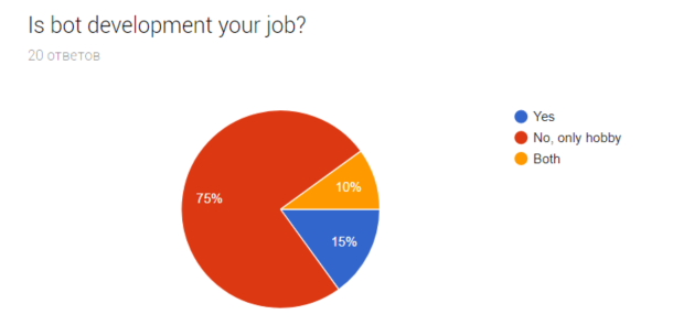 Как видно из пайчарта 85 % разработчиков ведут свою деятельность в качестве хоббы, при этом 25% занимаются этой деятельностью профессионально. О чем нам это говорит? В отрыве от реального количества разработчиков ботов только о том, что телеграм чатами групп поддержки пользуются в большинстве любители и те для кого это хобби.