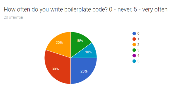 Интересно, что у всех разное мнение. Действительно часто пишут шаблонный код только 10% респондентов, а вот 55% уверены, что пишут такой код довольно редко и я думаю это связано с использованием библиотек для разработки ботов, которые снимают нагрузку в повторной реализации множества возможностей.