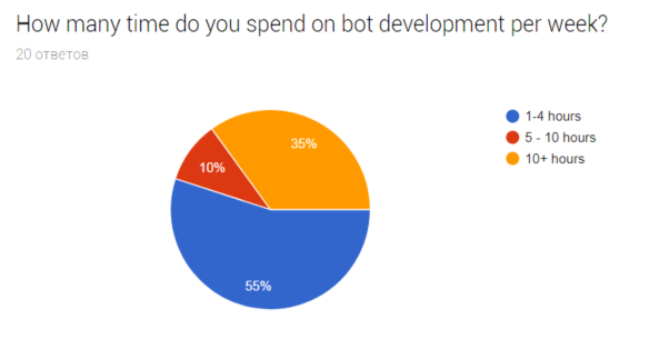 Не так часто люди занимаются разработкой, но вот, если занимаются, то основательно. 35% респондентов ответили, что трятят на разработку ботов более 10 часов в неделю.