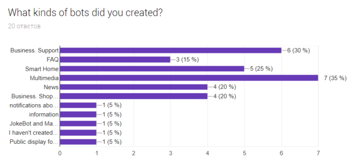 Большинство разработчиков создавало мультимедиа боты, т.е. с использованием графики, видео или аудио, затем следуют разработчики ботов для поддержки в бизнесе. Удивительно популярный ответ - Умный дом, честно говоря, этот вариант я придумывал без надежды на то, что его кто-то отметит. Новостные и магазинные боты делят четвертую позицию в списке, следом идут FAQ боты и пользовательские ответы. Один из пользовательских ответов "Я не создавал ботов ранее".
