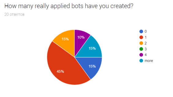 Учитывая предыдущею статистику, довольно интересно, что не смотря на большой процент новичков людям хватает опыта, чтобы реализовывать реальных ботов. Хотя, я думаю, что понятие "реально примененных" можно воспринимать по разному.