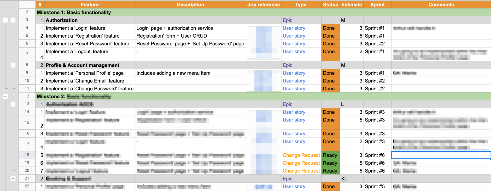 По мере приближения к началу разработки и по мере появления новых деталей, Epic декомпозировался на более мелкие задачи, user stories. Добавлялись spikes, POC задачи, если потребуются. В колонки ‘Sprint #’ проставлялись даты, когда ожидается задачу взять в работу.