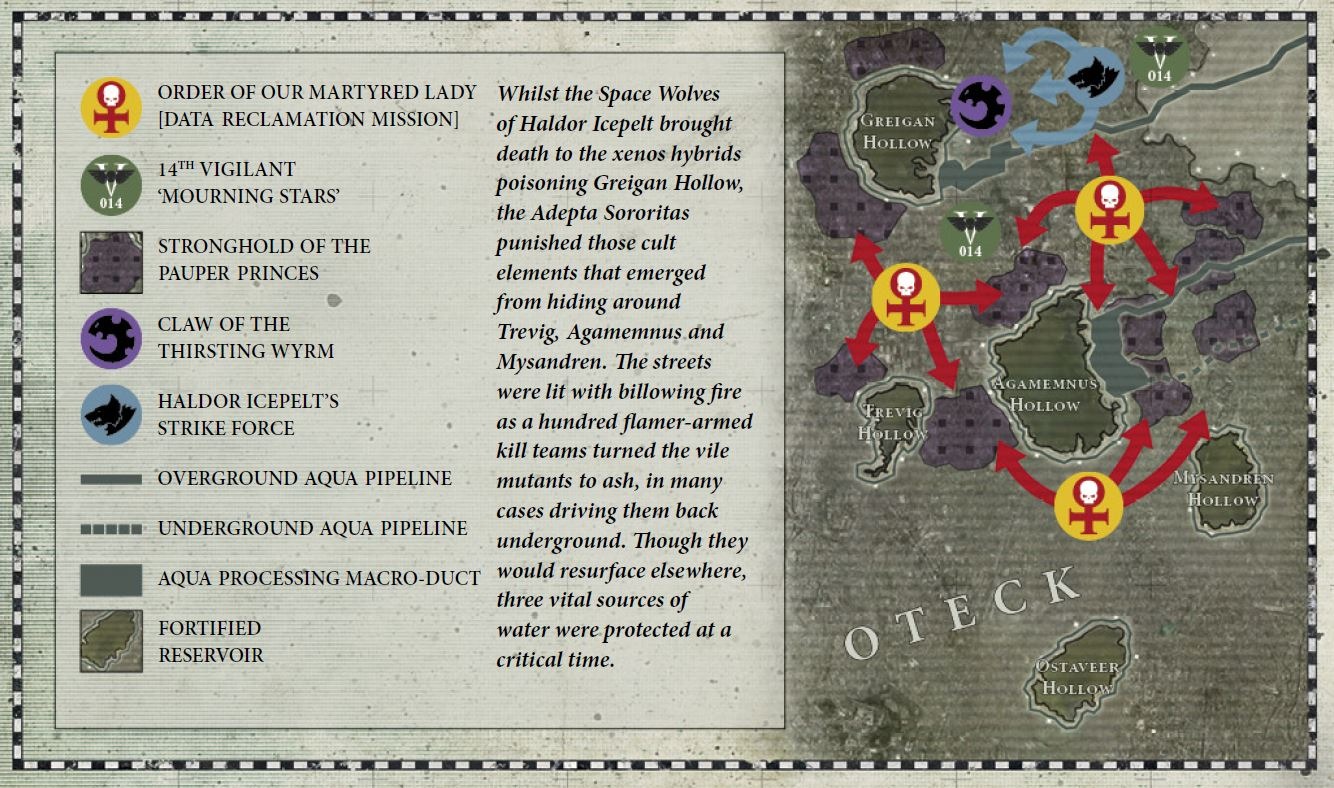 - Война Тварей (около 000.M41 - 015.M42) — Сражавшиеся на Вигилусе сёстры битвы во время войны Тварей, являлись жизненно важной частью его обороны. Без их веры, уверенности и стремления к победе, улей Отек почти наверняка пал — и Гиперия, вероятно, вместе с ним. Некоторые граждане описывают подвиги их воинской доблести, которые они демонстрировали в тех боях, как чудеса. Адепта Сороритас имеет гордую традицию, согласно которой их основатели лично разговаривали с самим Богом-Императором. Они представляют собой нечто большее, чем просто военное присутствие, поскольку они воплощают символ Имперской веры и поддерживают его огнем и яростью. На Вигилусе они защищали ульи от бесчисленных угроз, от земного бунта до сверхъестественных проявлений. Орден Пресвятой Девы-Мученицы боролся почти четыре тысячи стандартных лет за то, чтобы Вигилус не был запятнан скверной Хаоса. Они разместили свой гарнизон в Пристанище Святых, столице планеты и сердце Экклезиархии, еще с тех пор, как она была простым базиликаном, и простирающимися на сотни километров алебастровых валов и усеянных башнями бульваров. Будучи урбанизированными до такой степени, они сражались почти исключительно в застроенных районах улья, и благодаря этому Адепта Сороритас из Гиперии стали в значительной степени механизированной силой. У них было большое количество транспортных средств по их распоряжению, и они были хорошо знакомы с тактикой гражданского контроля во время конфликтов - настолько, что один вид их полуночно-чёрных машин заставлял население Гиперии убраться восвояси. Каждая канонисса и сестра супериор хорошо знали улицы города, изучая их в течение всей своей службы. С помощью сбора данных орденов Диалогус, предсказывающих вероятные зоны угрозы и направляющих их оптимальный переход из одного района улья в другой, сестры Гиперии были хозяевами своей территории. Если неверующий, еретик или прочая мерзость угрожала городскому району, сёстры битвы реагировали почти мгновенно. Именно это преимущество дома помогало им вновь и вновь отбрасывать орочьих захватчиков на начальных стадиях войны Тварей. Таково было влияние Адептус Министорум на Вигилус, что сёстры битвы под их командованием имели аббатства в каждом улье. Первоначально они были помещены туда, чтобы получить доступ в Пристанище Святых - или, скорее, для политического присутствия Экклезиархии, и, в течение некоторого времени планетарный губернатор Люсьенн Агамемнус возмущалась ими. Но когда орки медленно приближались к мегаполисам планеты, а из-под головокружительного числа улиц восстали генокрады из культа Нищих Принцев, истинная ценность Адепта Сороритас стала ясной. Там, где шли сёстры битвы, милость Императора сдерживала неестественную магию и изгоняла кошмары, как утреннее солнце. Там, где они сражались, народ сражался вместе с ними. Верховная канонисса, возглавлявшая Адепта Сороритас на Вигилусе, пламенная и вспыльчивая особа, известная как Темперанс Блейз, была настолько напугана, что весь правящий Аквиларийский совет предоставил ей полную свободу действий для ведения кампании на Вигилусе, какую она считала нужной. Под ней была сеть доверенных канонисс и селестианок супериор, которых она назвала "священными шипами", и каждой из них было поручено защищать интересы Министорума в разных ульях. Ког