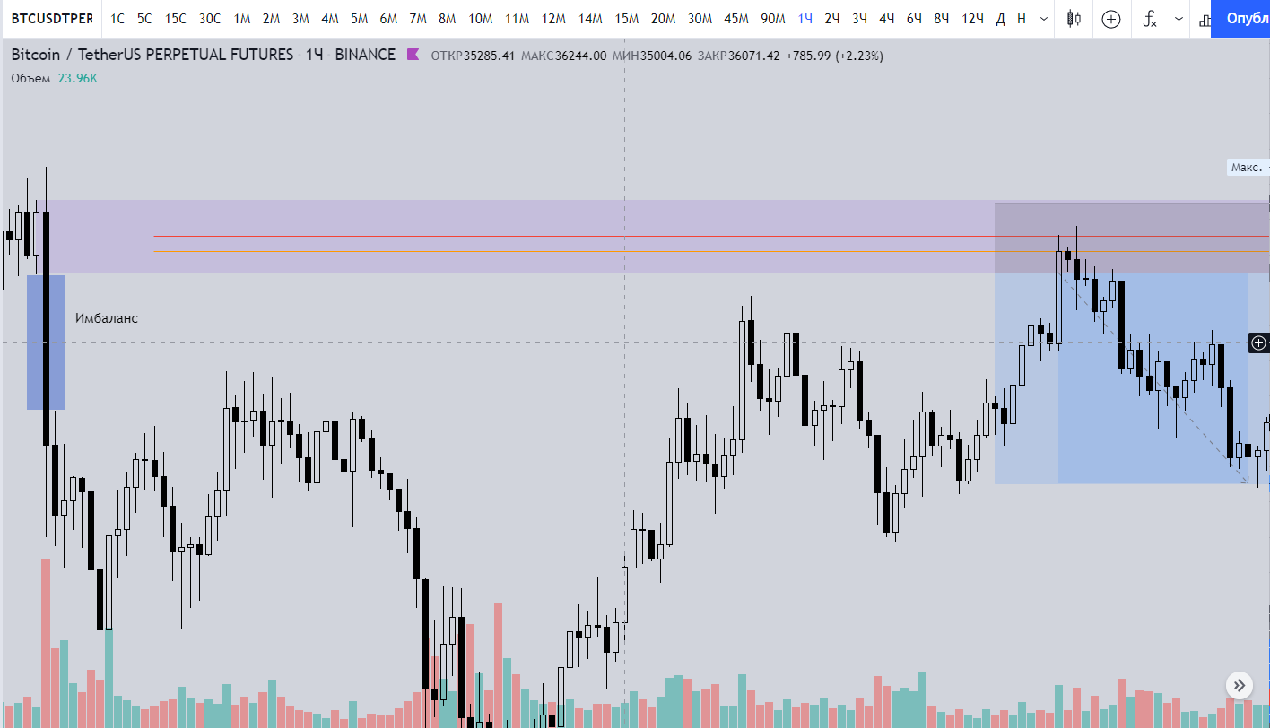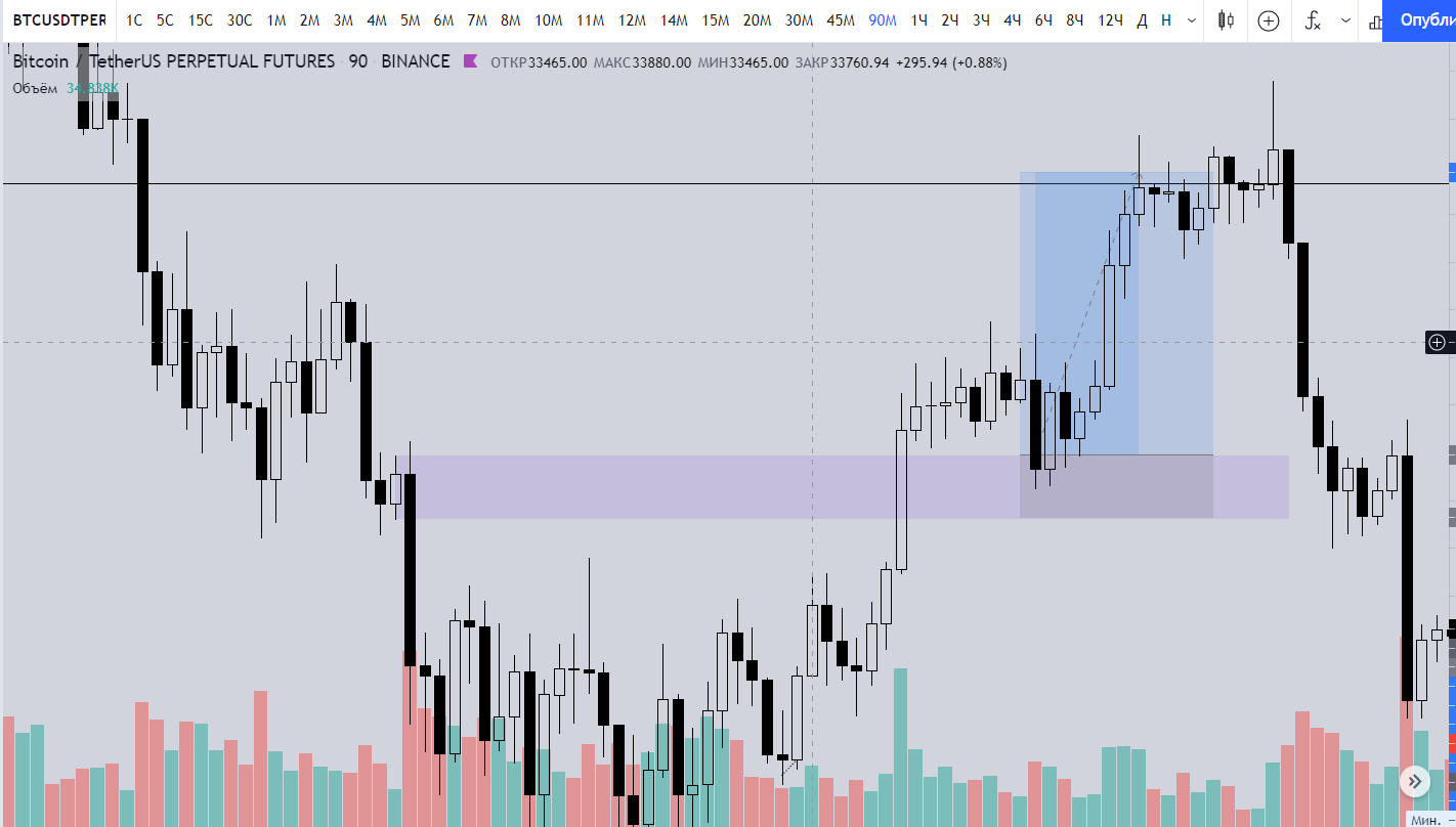 Это тот же Ордерблок, который мы импульсно пробили не получив никакую реакцию. После пробития, он для нас будет являться условным уровнем поддержки.