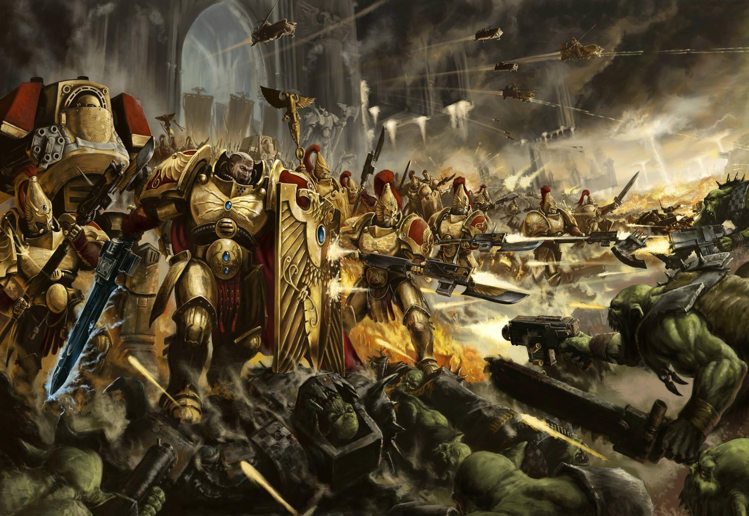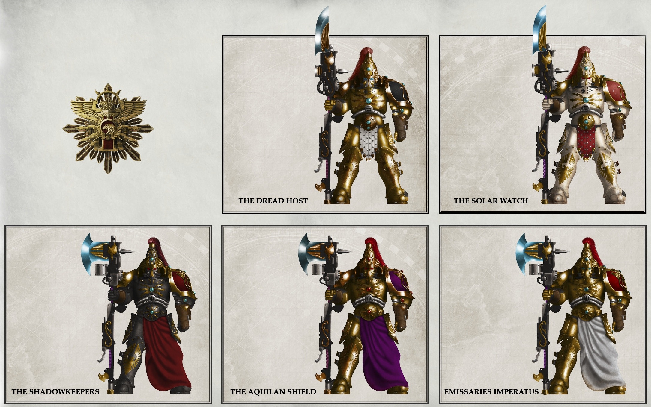Два остальных братства, что присутствуют на пикте, менее примечательны, но по-своему интересны. Аквилланские щиты призваны по воле Императора охранять имперских деятелей и важных персон. Будь то примарх Робаут Гиллиман, лорд-милитант, от которого зависит судьба Крестового Похода, или Инквизитор, они служат для того, чтобы защитить их ценой своей жизни. Эмиссары Императус же являются одними из немногих, кто ещё со времён Ереси внимают словам и просьбам Императора. Погружаясь в регулярные медитации, они слушают Его и истолковывают Его волю. Часто эти воины взаимодействуют и с другими братствами, но нередко и отправляются к звёздам, чтобы принести слово Императора генералу, капитану Астартес, или любому другому, на кого укажет воля Того, Кто на Терре.