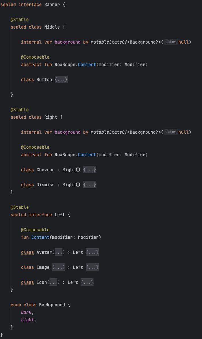 Очевидно надо было думать, как это раскидать в отдельные файлы, сохранив при этом преимущества подхода с типизированными слотами. К счастью, структура c использованием sealed inteface/class, которая лежала внутри одного модуля, давала возможность отрефакторить это дело позже, так как у клиентов не было возможности раширить слоты.