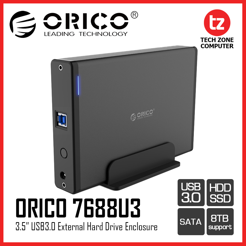 3 .5 inch USB3 .0 External Hard Drive Enclosure . Model . ORICO 7688U3 . Material . Aluminum Alloy + ABS . Output Interface . USB3 .0 Type-B . Color . Black . Supported HDD . 3 .5 inch SATA HDD . Installation . Screw Fixation . Indicator Light . Blue When It's Energized, Blue and Red Light Flicker When It Reads and Writes Data . Supported System . Windows/Mac/Linux .