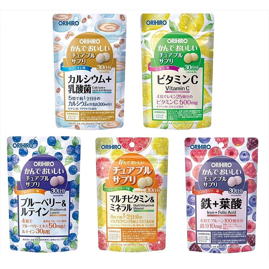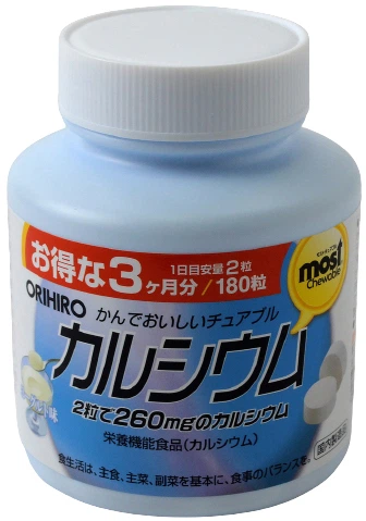 orihiro Кальций и витамин Д - жевательные витамины со вкусом кофе с молоком с кальцием и витамином Д . Состав: (содержат в 5 жевательных таблетках) кальций - 350 мг . , магний - 40 мг . , витамин D: 5 .0