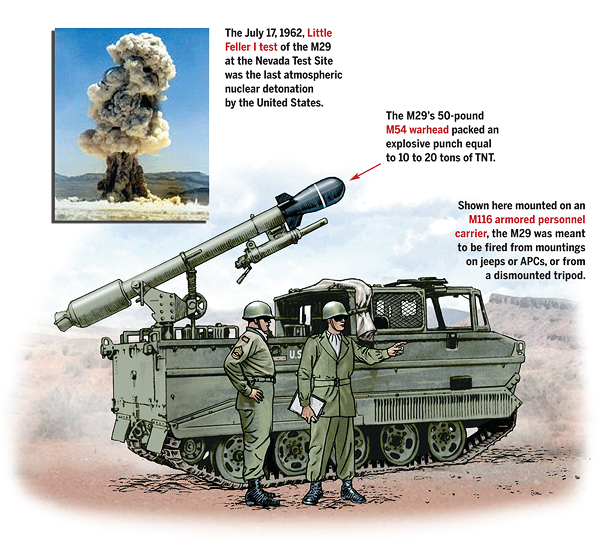 Единственным типом ядерного оружия «ближнего» боя, принятым на вооружение в США, стала система «Дэви Крокет» («Davy Crocett»). Эта система включала в себя два гладкоствольных безоткатных орудия М-28 и М-29 калибром 120 мм и 155 мм, созданных по схеме «уширенная камора». Оба орудия стреляли одинаковым надкалиберным снарядом М-388 с ядерным зарядом W-54Y1. Калибр боевой части снаряда 279 мм, длина 762 мм, вес 35 кг. Мощность заряда по различным данным составляла от 0,05 до 1 кт. С 1961 г. по 1971 г. было изготовлено свыше 2100 ядерных зарядов W-54 Y-1 для системы «Дэви Крокет». Обе системы разбирались. Легкая система М-28 на поле боя переносилась тремя номерами расчета во вьюках весом около 18 кг. Обе системы стреляли с треноги и с джипа. При стрельбе с джипа с задней части кузова откидывалась опорная рама с сошниками. Система имела оптический прицел. Легкое орудие снабжалось 20-мм пристрелочным автоматом.