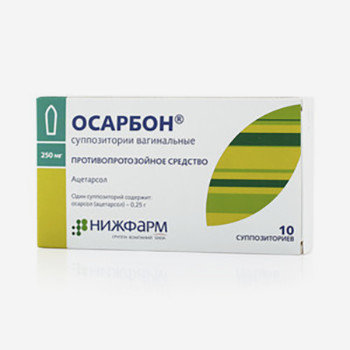 Общая характеристика препарата Осарбон Лекарственное средство выпускается в виде свечей для интравагинального введения . Одна свеча включает в свой состав 250 мг действующего вещества, которое представлено компонентом ацетарсол . В качестве дополнительных составляющих в аннотации указана глюкоза и борная кислота . Жировая основа препарата - витепсол .