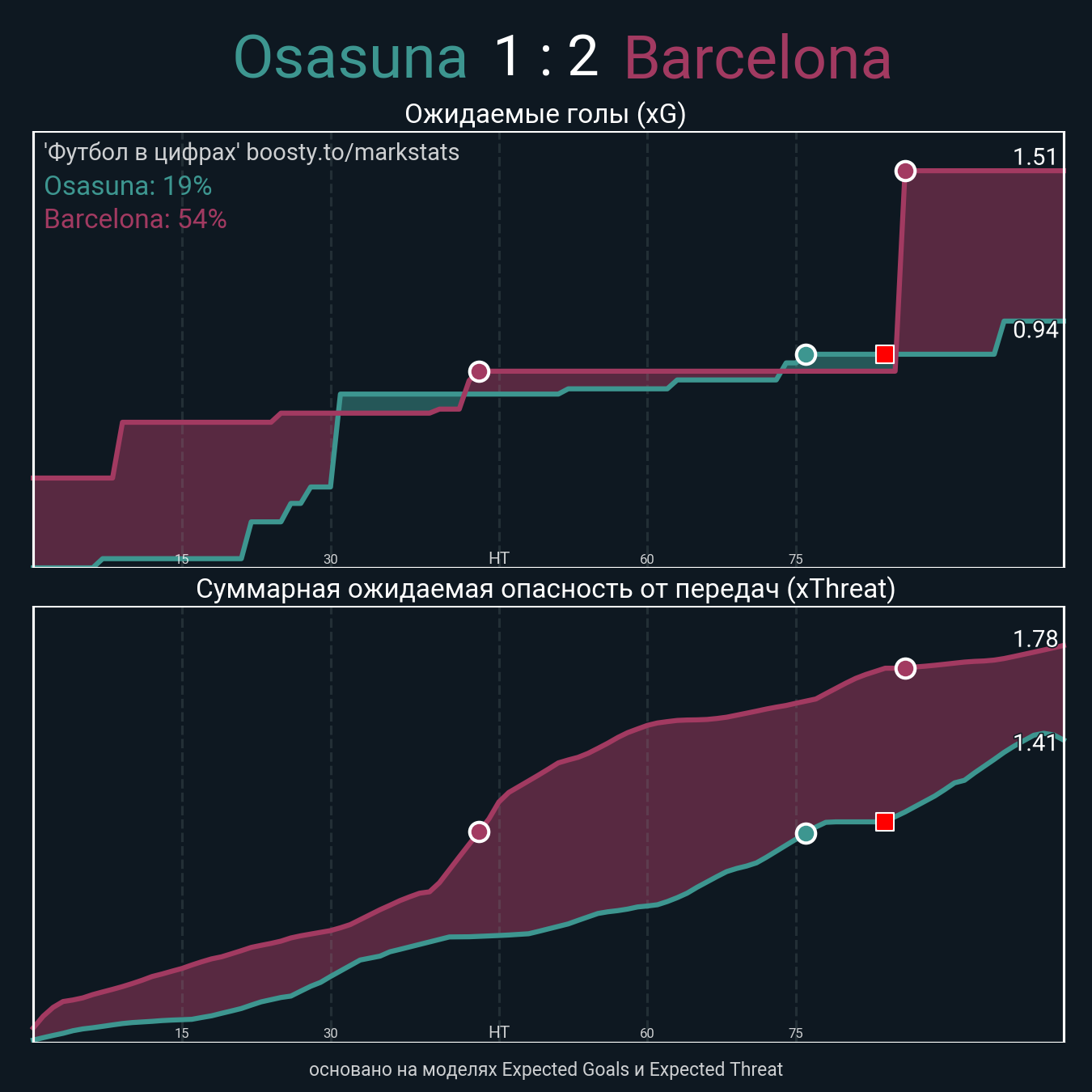 Ожидаемые голы (NPxG): 0.94 - 0.75