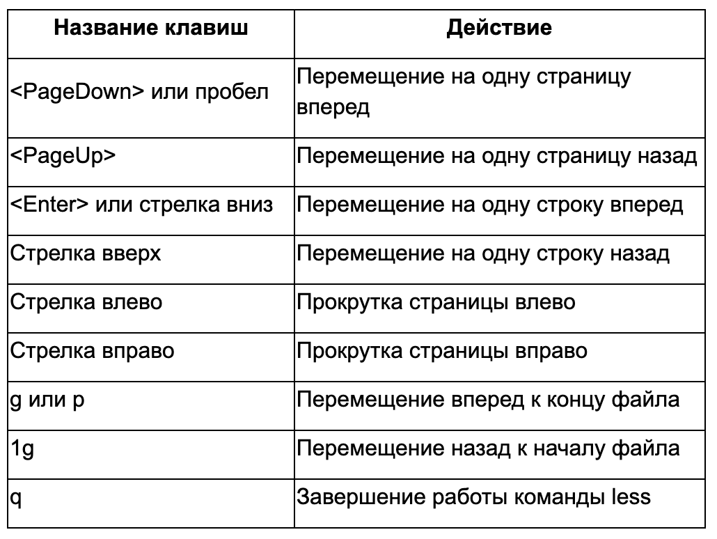 cat не самая удобная команда, поэтому можно воспользоваться командой less, которая позволяет постранично просматривать содержимое документа. В таблице ниже указаны какие клавиши можно использовать при работе с командой less: