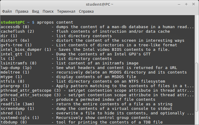 apropos content - поиск команд по ключевому слову content