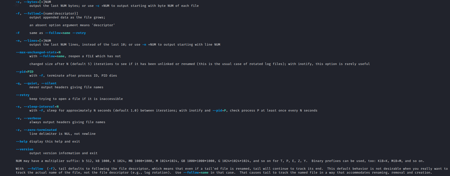 - -n (--lines) — показывает заданное количество строк вместо 10, которые выводятся по умолчанию. Если записать эту опцию в виде --lines=[-]NUM, будет показан весь текст кроме последних NUM строк.
