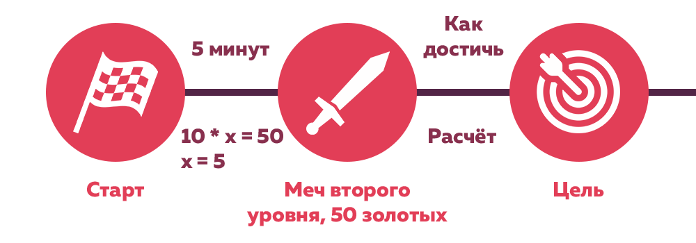 • среднесрочные: квест, задача. Каждая ведёт к финальной цели. Случается разреженно: раз в час, в неделю, в месяц. Чтобы убить дракона, нужен меч, доспехи и пять спутников;